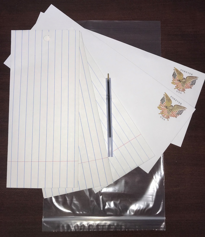 | CONTAINS THE FOLLOWING IN PACK: 3 Each - 8.5x11 Lined Paper 2 Each - Prestamped Envelopes #10 ( Forever ) 1 Each - Flex Pen - Black Placed in a Reclosable Bag |